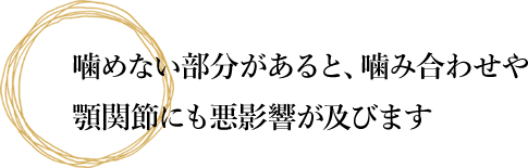 虫歯や歯周病を放置していると、その部分をかばい、反対側の歯でかむことが多くなります。噛めない部分があると、かみ合わせが狂い、顎関節症などを引き起こすこともあります。